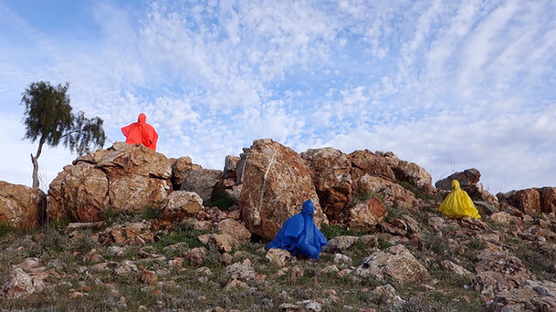 creatures dressed in plastic rain ponchos as they gather, swarm and glut glut glut, consuming the landscape around them.