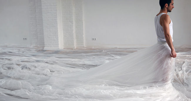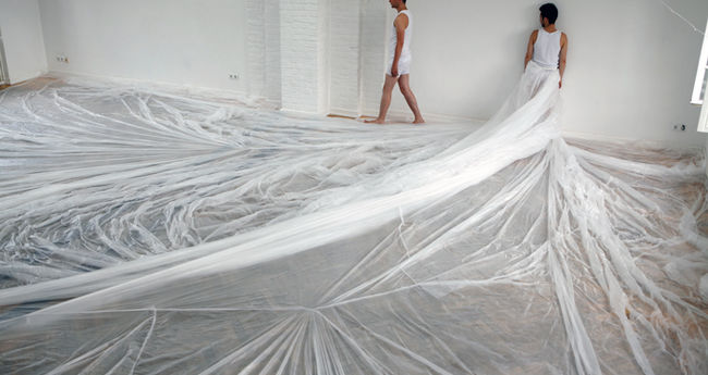 On the top floor of the building, two male performers slowly circled the space, swathed in flowing folds of white plastic sheeting.