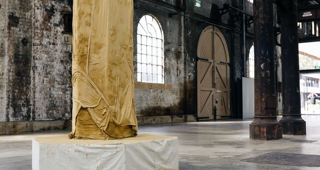 For Liveworks 2018, 110% developed a large-scale installation and performance work that responded to the industrial heritage of Carriageworks, the festival presentation venue. Using a combination of steel scaffolding, raw clay, foam, canvas and performing bodies, the trio rezoned the building’s public space into a site of active art occupation. Throughout the festival period, the parasitic installation of porous and leaking architectural forms received ongoing support and attention from a team of highly disciplined workers who performed gestures of construction, maintenance and care. Through an accumulation of tactile pressures of trace and touch, 110% produced an onsite ooze industry that sought to sweat the foundations of minimal sculpture and collaborative practice.