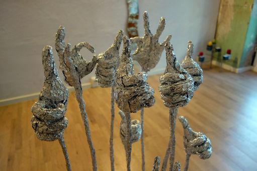 In the ground floor of the gallery, a series of sculptures and video explored uncertain verticalities and states of being OK: A bright cluster of aluminium foil hands gesturing that it's 'A-OK' and 'Thumbs Up', a video loop of a yogic candle revolving in meditative bliss atop a toilet cistern, a mirror bearing toothpaste affirmations, a time piece sponge stack and a shower curtain emblazoned with the exhibition's willfully positive declaration: 'Things are going great in your absence.'