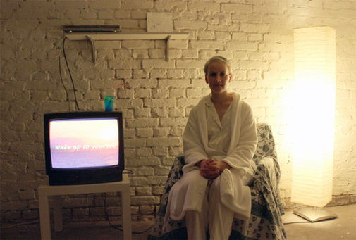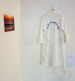 In the basement level, Dillon staged a performance for opening night called Wake up to Yourself. Audience members were invited to enter the basement space one at a time. They were asked to wear a bathrobe embroidered with, 'I'd rather be wearing a smile.' On entering the space the audience member was greeted by the artist dressed in an identical robe and asked if they would slap her across the face. If this request was refused, Dillon asked if they would allow her to slap them across the face. Participants were permitted to continue this exchange as long as they wished. 'Wake up to yourself' explored frameworks of permission and control within the context of live performance. The work was intended as a situation of potential violence and pain within the exhibition, rupturing the meditative tone of the sculpture and video works displayed in the gallery ground floor.