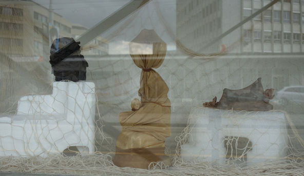 An installation of found objects, stolen materials and recycled fabrics gathered during an undercover investigation of the Geneva Free Ports, installed in six glass display cases opposite the free ports site.