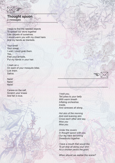 This series of digital collages samples and scrambles extracts of email correspondence sent between the artist and her partner and collaborator, Swiss choreographer and performer, Gregory Stauffer, during periods of long-distance separation from February 2016- April 2018. The texts present an absurd and disjointed dialogue of recollections, plannings and projections of encounters between two bodies divided by temporal and geographic distance. These intimate exchanges are layered over a watermarked background of Australian and Swiss iconography to reflect how cross-border relations are actualised through the negotiation of administrative, legal and economic barriers.